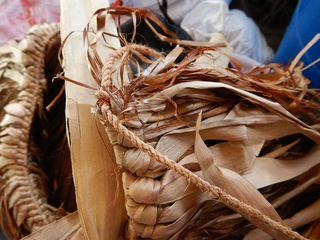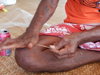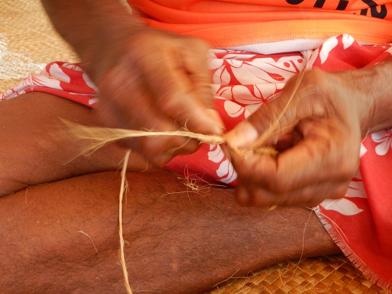 ココナツの繊維(makakafa)を2,3本より合わせてつくる.