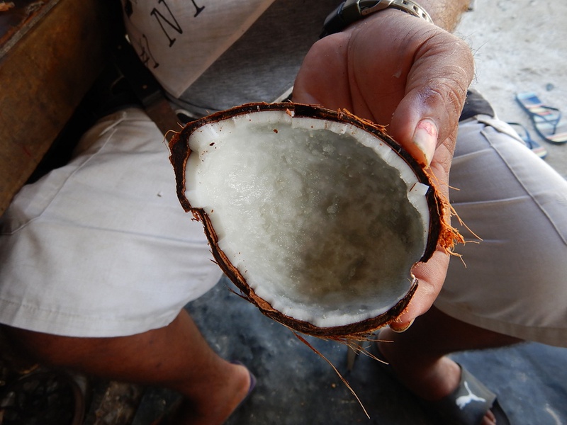 発芽したココナッツ(utanu)を半分に割り,中にできたスポンジ状の果肉を取り出した後に残る殻の部分