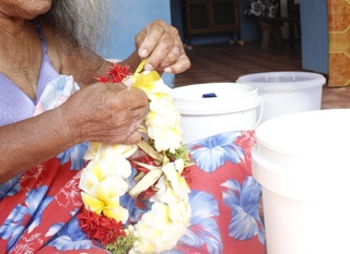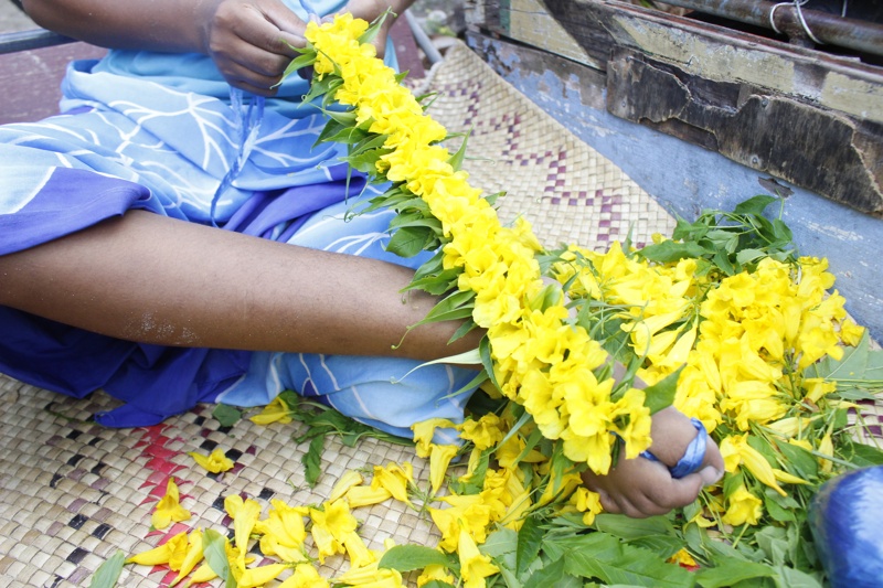 一般的に編み物をしたり,髪の毛を三つ編みにしたり,ひもを縒ったりすることを指す.fili te fou:花輪を編む.[参]