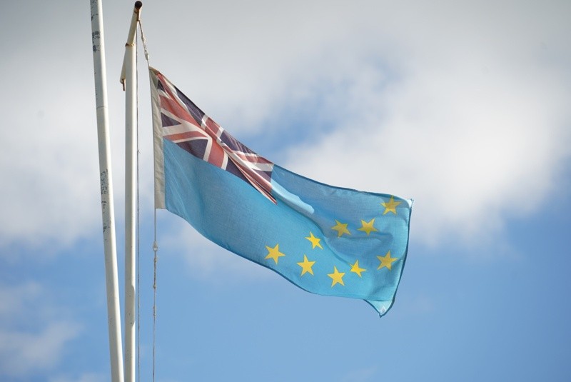 写真は掲揚されたツバル国旗.水色をベースに,左上に英国のユニオンジャックを配し,右側に国を構成する9つの島を表す9つの黄色い星が配置されている.
