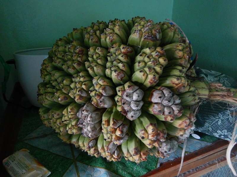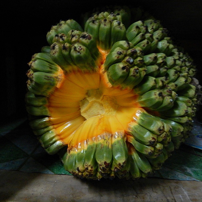 緑がかった青灰色粉状の皮を持つバナナ.未熟のものを調理して食べたり、熟した実を果物として食べる.